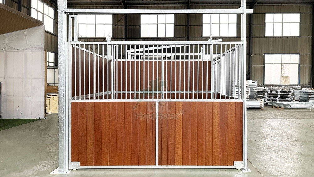 Nos cloisons de box sont fabriquées en acier massif et les panneaux pour chevaux sont conçus avec des planches en bois à assemblage par rainure et languette, offrant une grande solidité et une résistance aux coups de pied, prolongeant ainsi leur durée de vie. Des connecteurs robustes sont également fournis pour une fixation stable au mur et au panneau avant.
